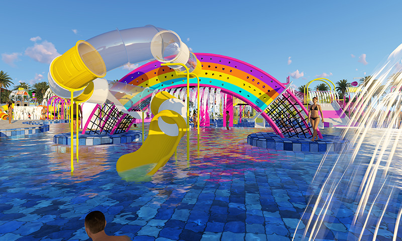 本案例设计灵感来源于孩子们喜欢的梦幻世界,以及小朋友喜欢的梦幻水滑梯,这里充满的无穷的欢乐,可以在这里幻想喜欢的世界,体验梦幻世界中的欢乐,小朋友可以在彩虹中尽情的戏耍打闹,欢快的追逐天边的缤纷彩虹,整个水上乐园充满活泼奇特、色彩缤纷,在这里能够游泳、能够健身,让孩子们在玩的过程中激发了想象力,提高勇于挑战的勇气和游玩带来的欢乐!