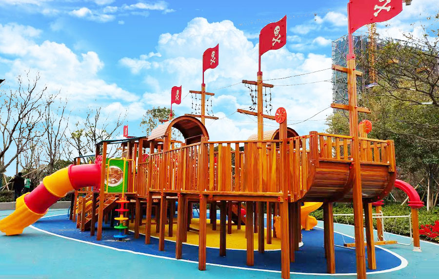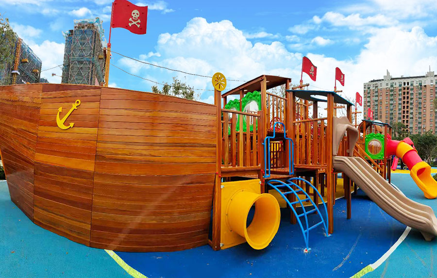 非标木制滑梯组合案例采用海盗船的设计主体为原型设计,增加了大型滑梯组合以及攀爬、钻洞等功能,整个主体设备采用木制结构,leyu.com乐鱼游乐生产的木制游乐设备具有颜色艳丽、外观漂亮,实用性强、经久耐用、安全性能好等特点,为小朋友的玩耍提供了一个很好的场所。