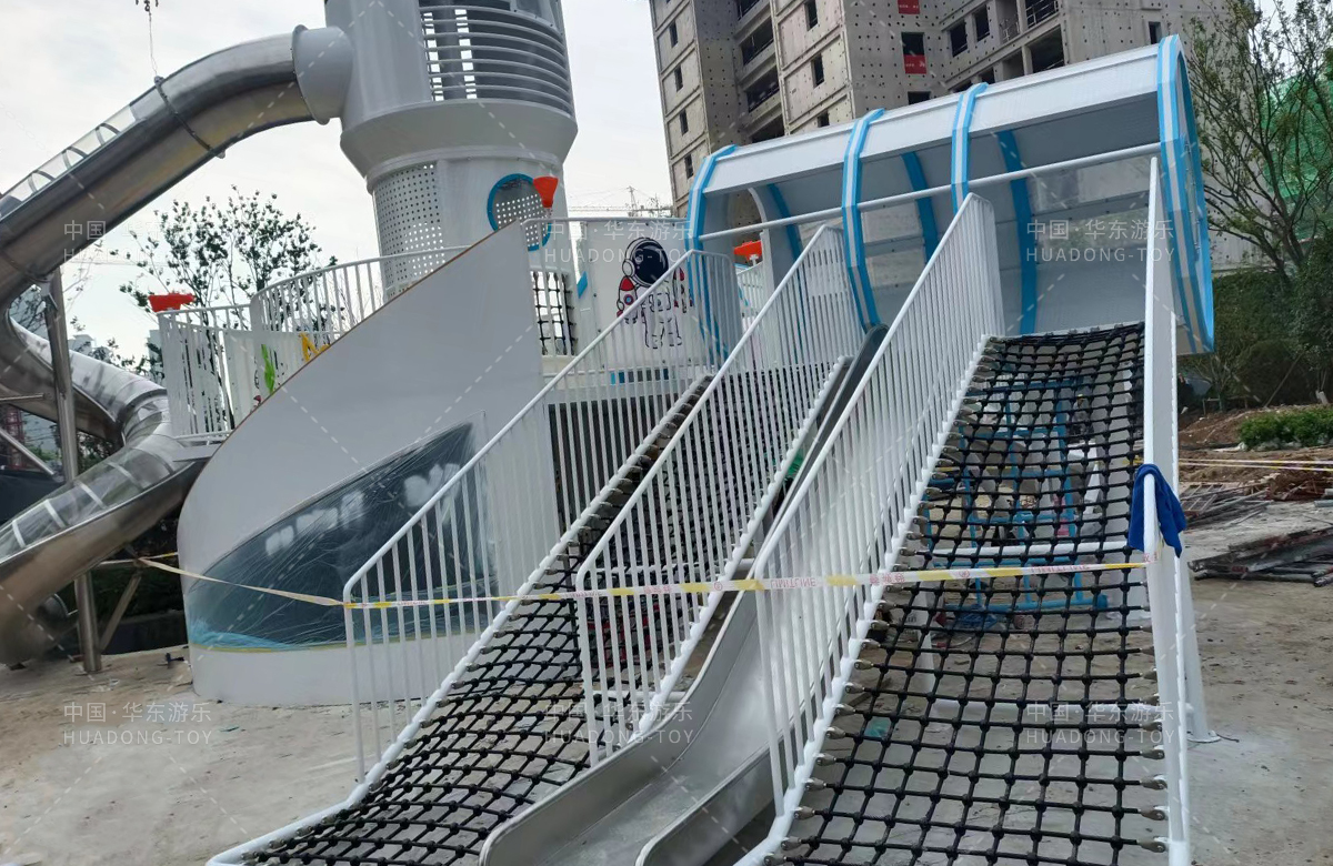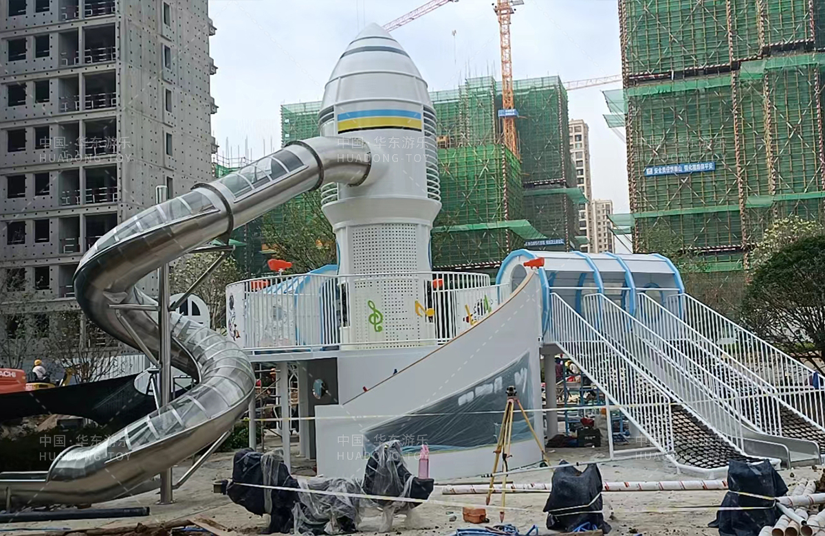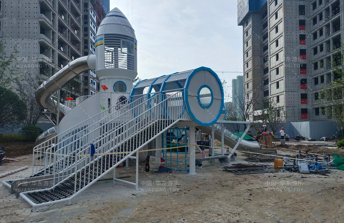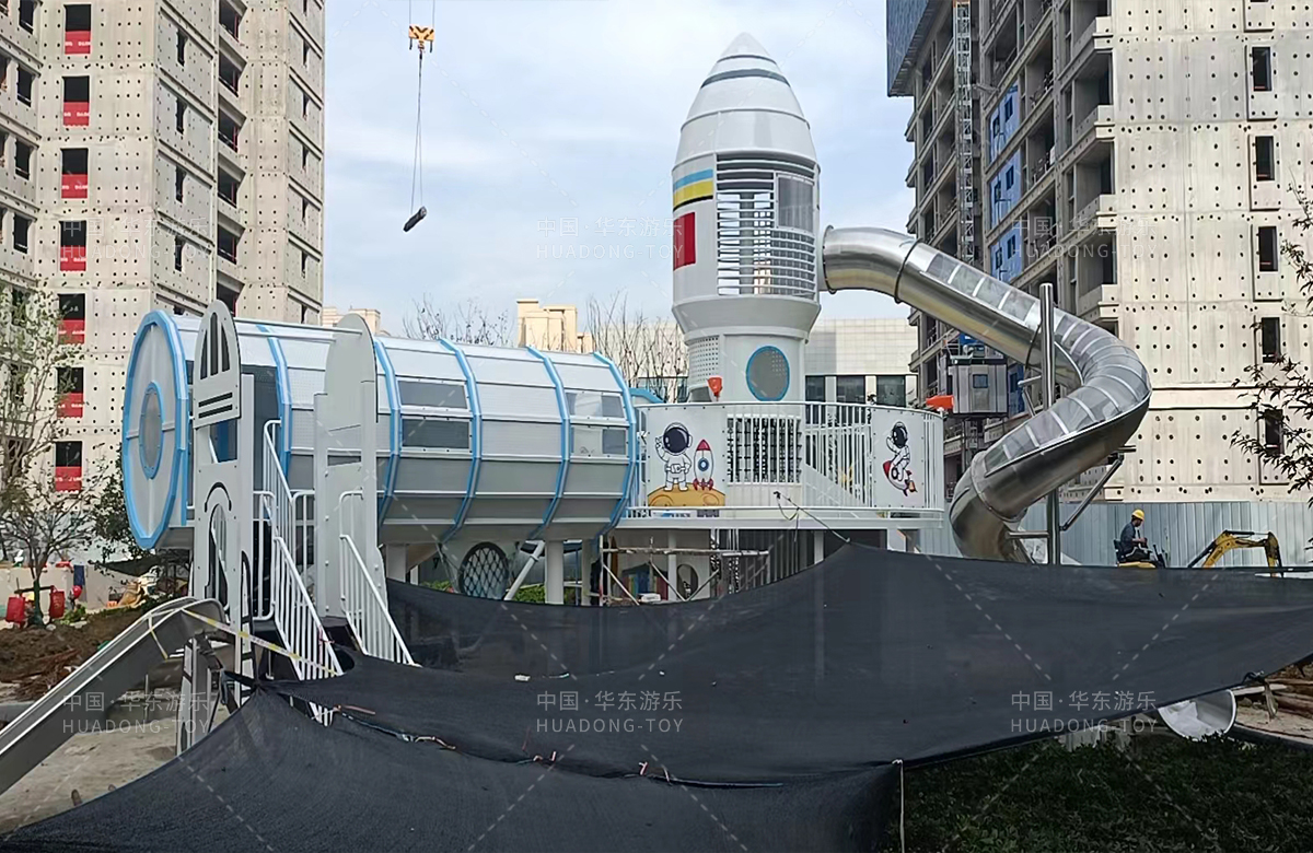 安徽省亳州市涡阳县荣徽上河郡选用的是leyu.com乐鱼游乐自主研发和生产的以航天飞机为主题的大型非标定制的游乐设备,是一款具备了攀爬网、攀爬梯、旋转滑筒、儿童摇摇乐为一体的综合性儿童游乐场。